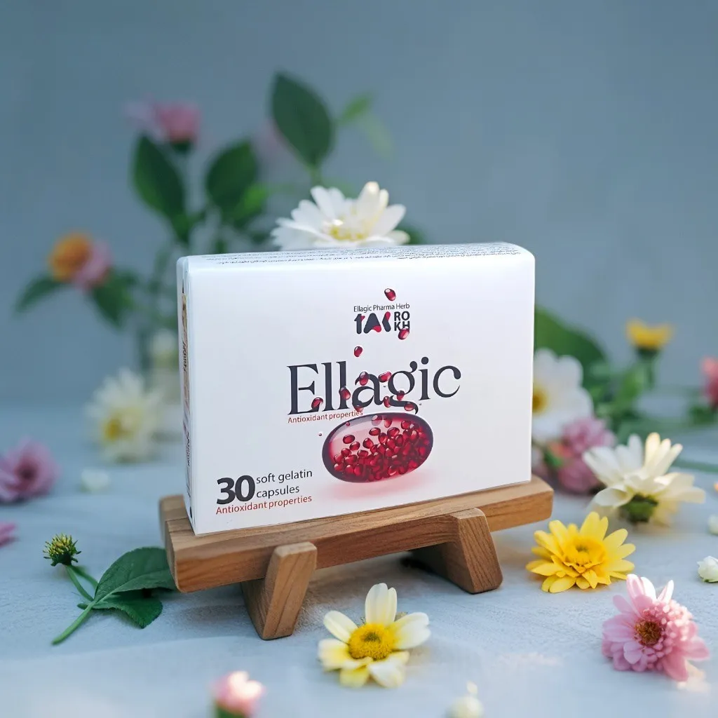 ““سافت ژل الاژیک اسید عصاره انار” حاوی ماده موثره الاژیک اسید میباشد. اسید الاژیک یک پلی فنول با خواص آنتی اکسیدانی است که در میوه های مختلف از جمله انار یافت می شود. این به دلیل فواید بالقوه برای سلامتی مانند خواص ضد التهابی و ضد سرطانی شناخته شده است. موارد مصرف مکمل الاژیک اسید عصاره انار کمک به حفظ سلامت قلب، شادابی پوست و خاصیت آنتی اکسیدانی بالا جهت پیشگیری از بیماری ها می باشد. روش مصرف: 2 بار در روز، هر بار یک کپسول همراه غذا میل شود.